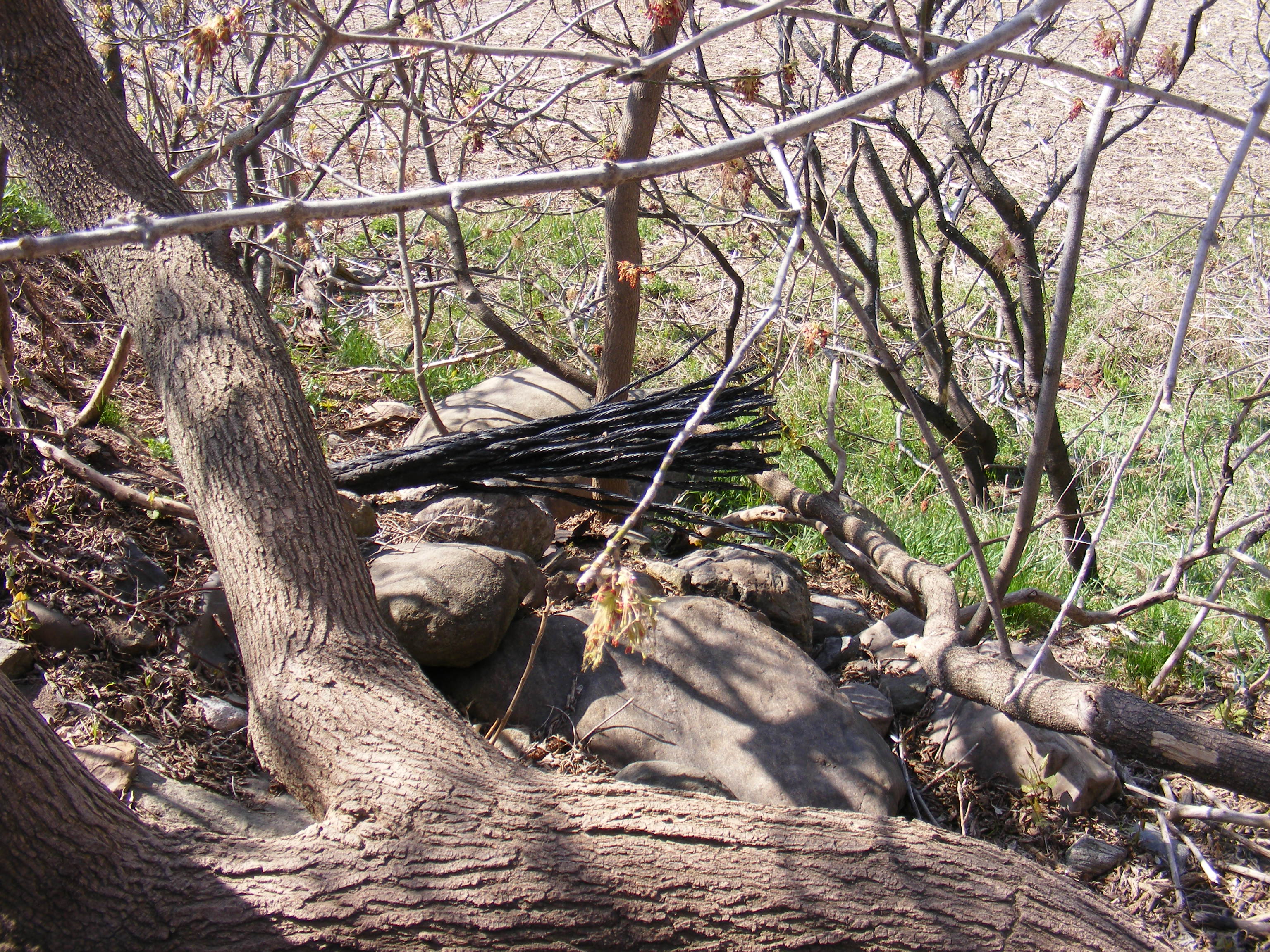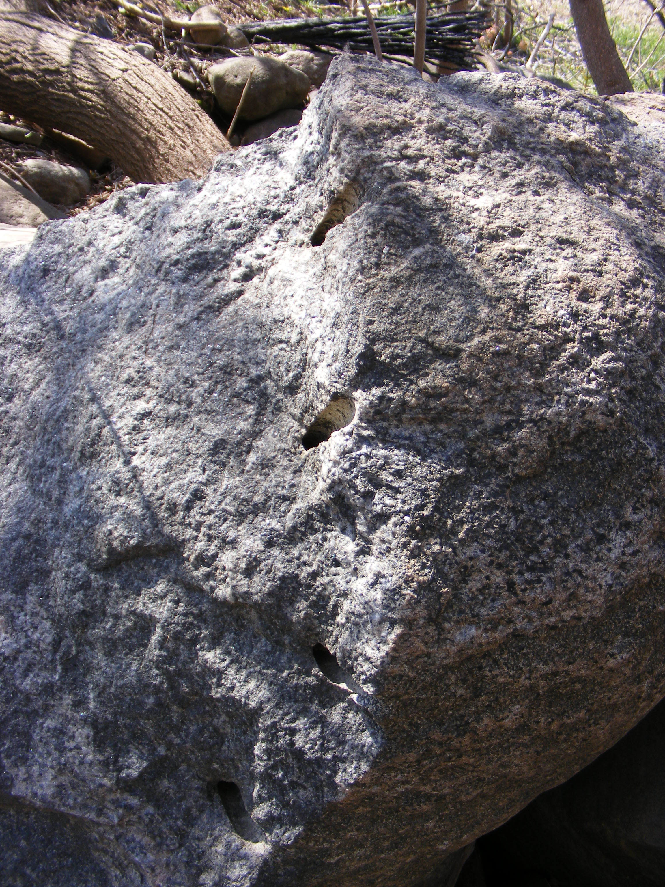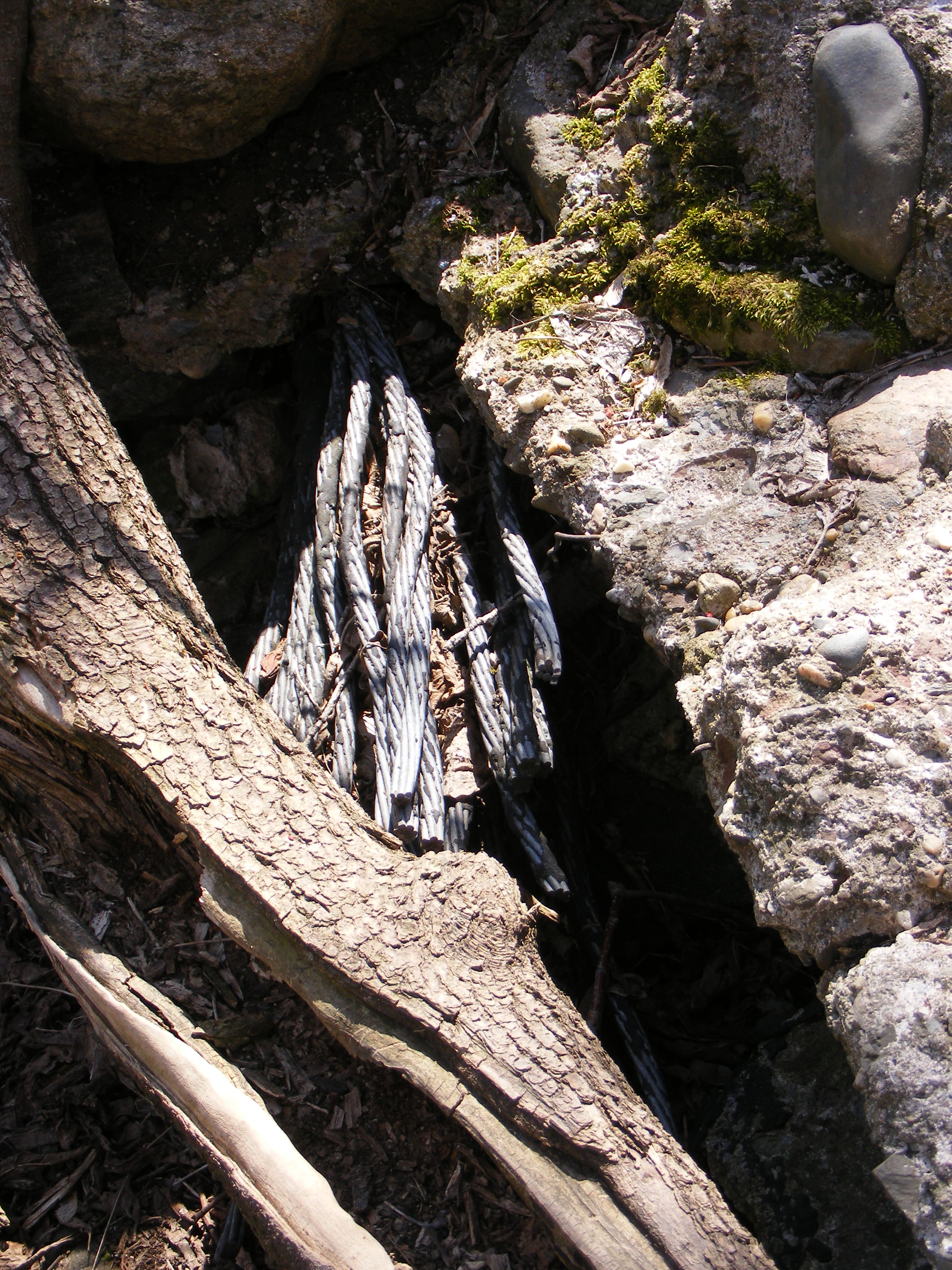 Trou dans une roche (plusieurs roches possèdent des trous similaires à cet endroit) et derrière : câble
