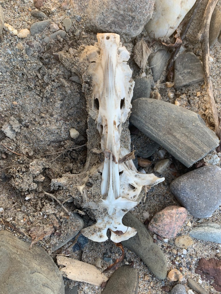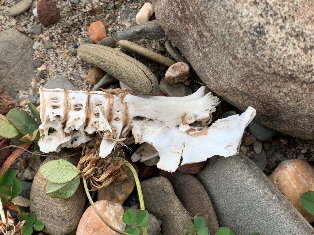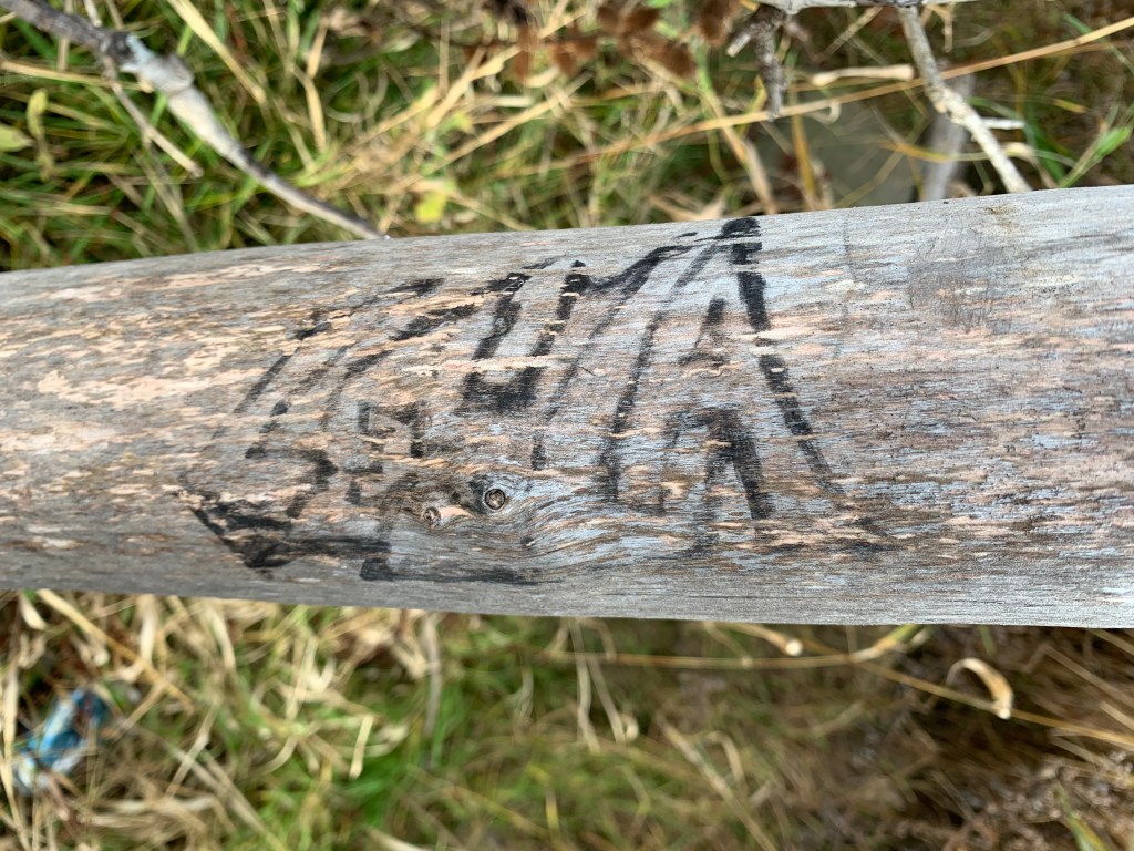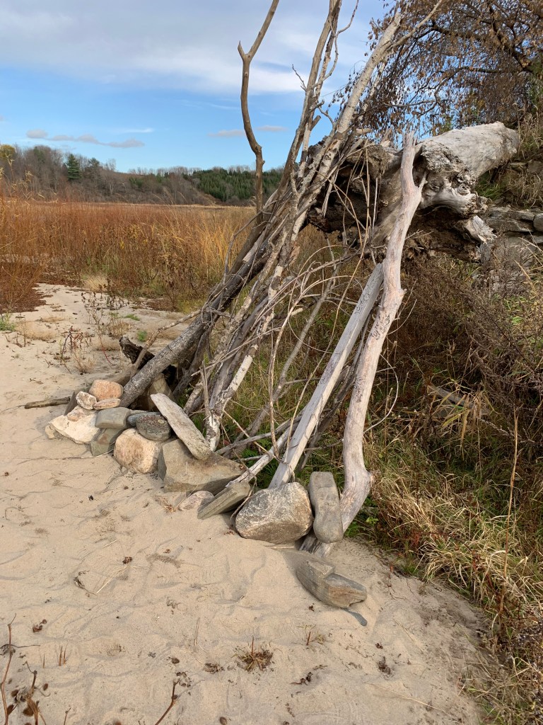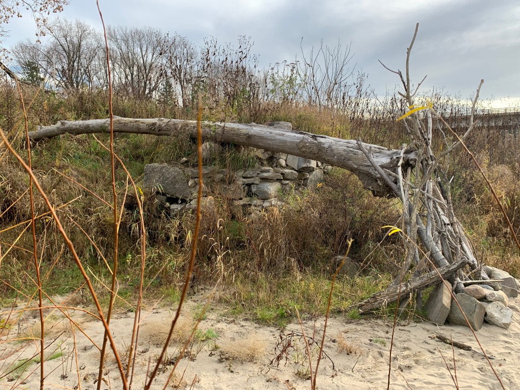Construction humaine fait de branches, bois flotté, roches et d’un très grand tronc