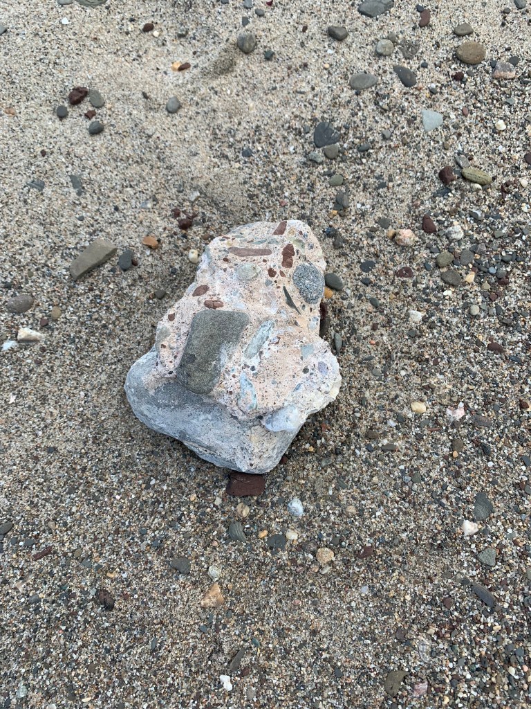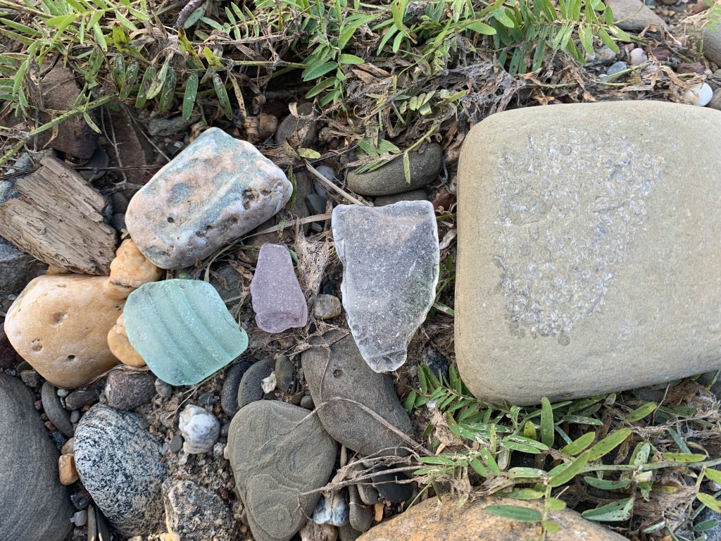 Roches, morceaux de verre: turquoise, rose, transparent et petits fossiles sur une roche