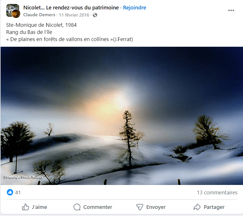 Photo publiée Claude Demers , le 11 février 2016, selon la description photo du rang du bas de l’île à Sainte-Monique en 1984. Nous pouvons voir cette photo sur la page Facebook Nicolet… Le rendez-vous du patrimoine