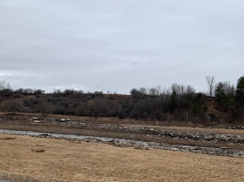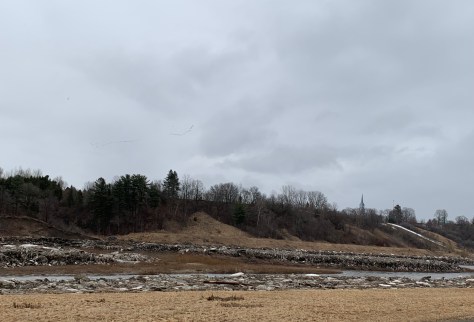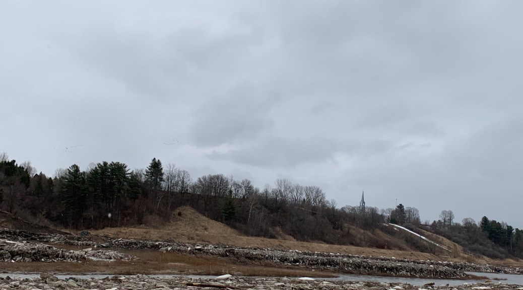 18 mars 2024. Rivière Nicolet bordée de glace, Sainte-Monique, le long du bas de l’île.