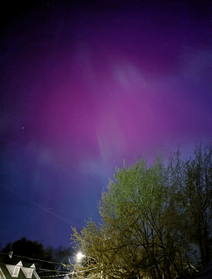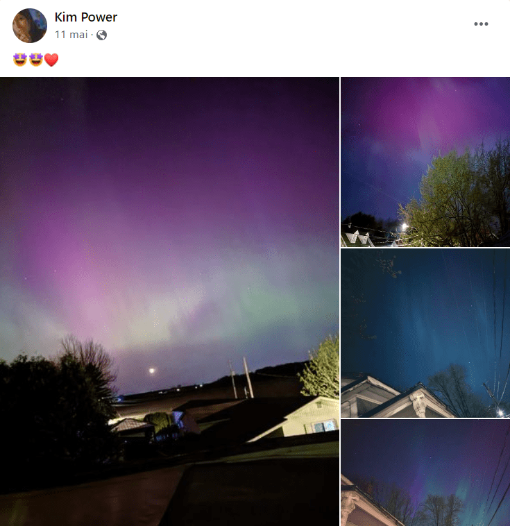 Photos publiées par Kim Power sur la page Facebook Spotted : Ste-Monique de Nicolet le 11 mai 2024. Photos où l’on voit le ciel de Sainte-Monique et des aurores boréales, un petit bout de la rue Saint-Adolphe et une partie de la rue Principale également.