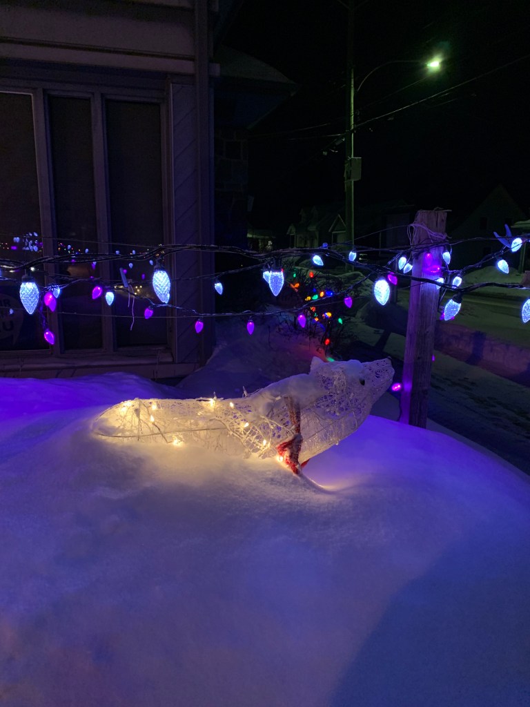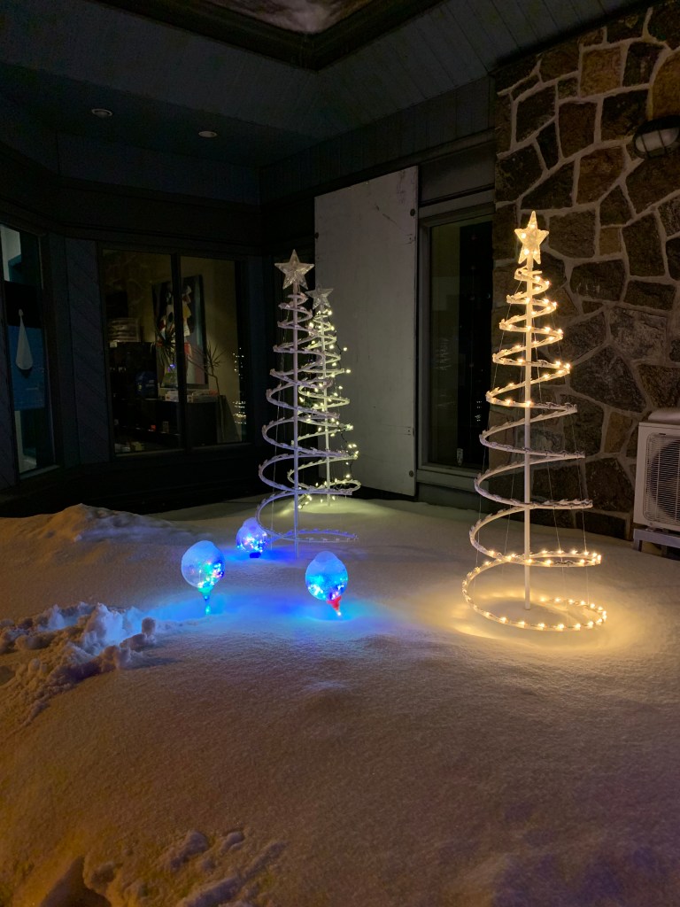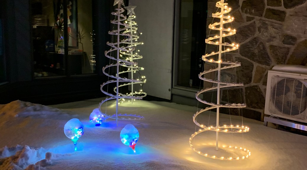 Lumière de noël situées au côté du bureau de la municipalité et de la bibliothèque, 8 février 2022, Sainte-Monique de Nicolet.