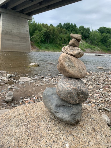 Peinture et empreinte de mains sur des roches, sur la plage de la rivière Nicolet à Sainte-Monique. 3 juillet 2024