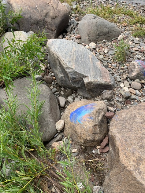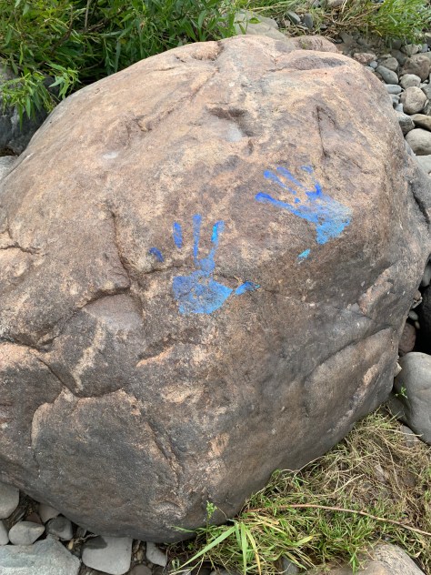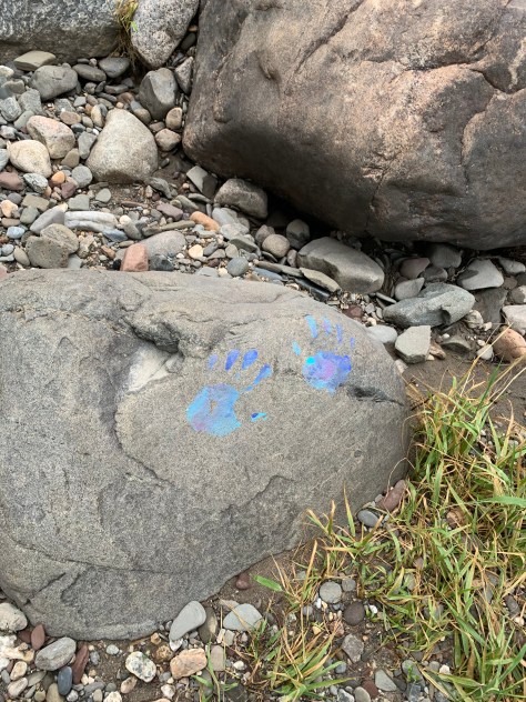 Peinture et empreinte de mains sur des roches, sur la plage de la rivière Nicolet à Sainte-Monique. 3 juillet 2024