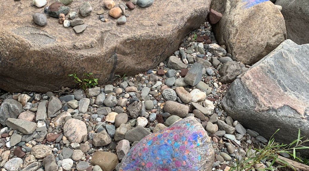 Peinture et empreinte de mains sur des roches, sur la plage de la rivière Nicolet à Sainte-Monique. 3 juillet 2024